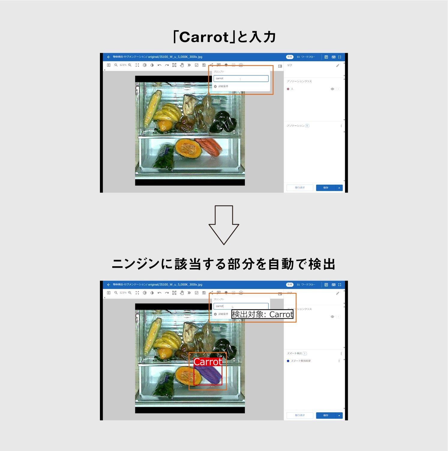 小塚ええ。「Carrot」と入力すると、ニンジンに該当する部分が自動でマークされます。これによって、ニンジンがどんなものかをAIに学習させるのに必要な、教師データの1つができあがるんです。