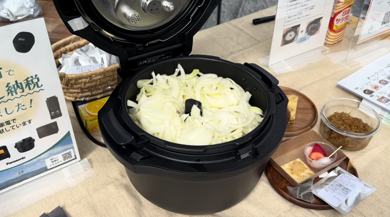 その中でもオートクッカーは、料理が苦手な方や忙しい方でも、日々の食事を楽しめるよう設計された調理家電です。自動で鍋底からかき混ぜながら調理できるため、煮物や野菜炒め、チャーハン、から揚げなどの揚げ焼きなど、さまざまな料理を簡単に作ることができます。たとえば、今回のイベントで試食品として提供した「坂ノ途中の新たまねぎで作ったあめ色たまねぎ」のように、通常は手間がかかるメニューも、材料を入れるだけで自動で仕上げることができます。店頭ではオートクッカーによる実演を行い、通りかかったお客様の関心を集めていました。